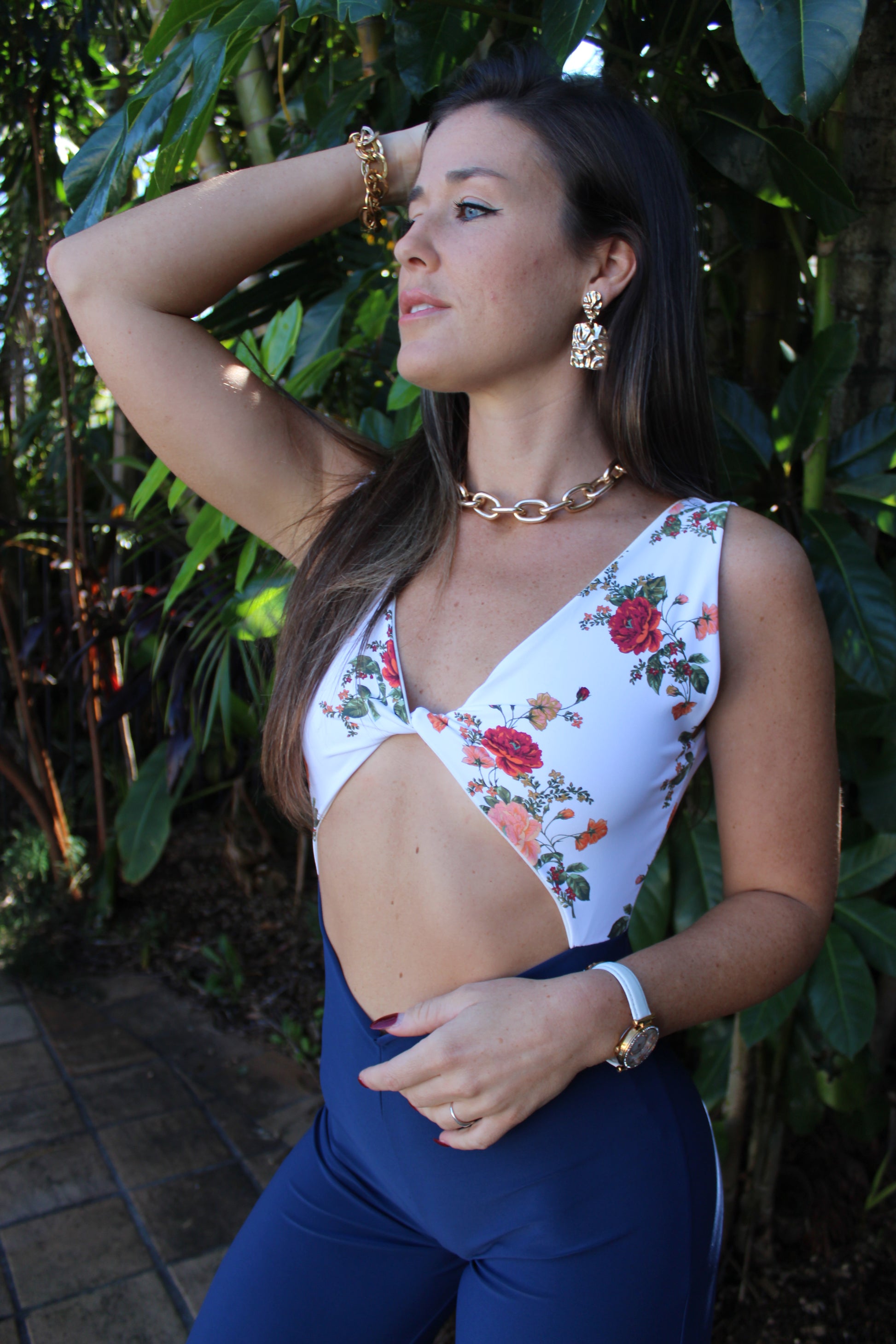 - Sleek Contrast: Bright white floral V-neck top paired with classic solid blue wide-leg pants.