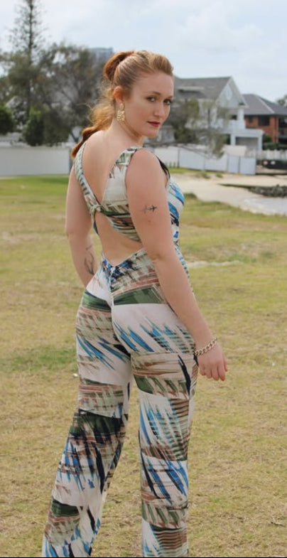 Crafted entirely from smooth, high-stretch lycra, the jumpsuit is a canvas of continuous style, featuring a vibrant green and white stamp/print that travels beautifully from shoulder to ankle. The upper section maintains a flattering, sensual cut with a sleeveless V-neck and deep V-back. The lower section embraces dramatic flow with the signature wide-leg pants, creating a spectacular, uninterrupted motion ideal for dancing. For a great finish includes a subtle scrunch detail at the bum provides a beautifully sculpted and confident fit.
