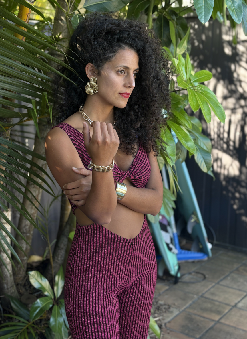 Crafted from shiny, stretch fabric with subtle stripes, it hugs your curves while allowing freedom of movement. The deep burgundy hue, wide-leg silhouette, and booty-scrunch detail at the back combine to create a look that is both dramatic and flattering.